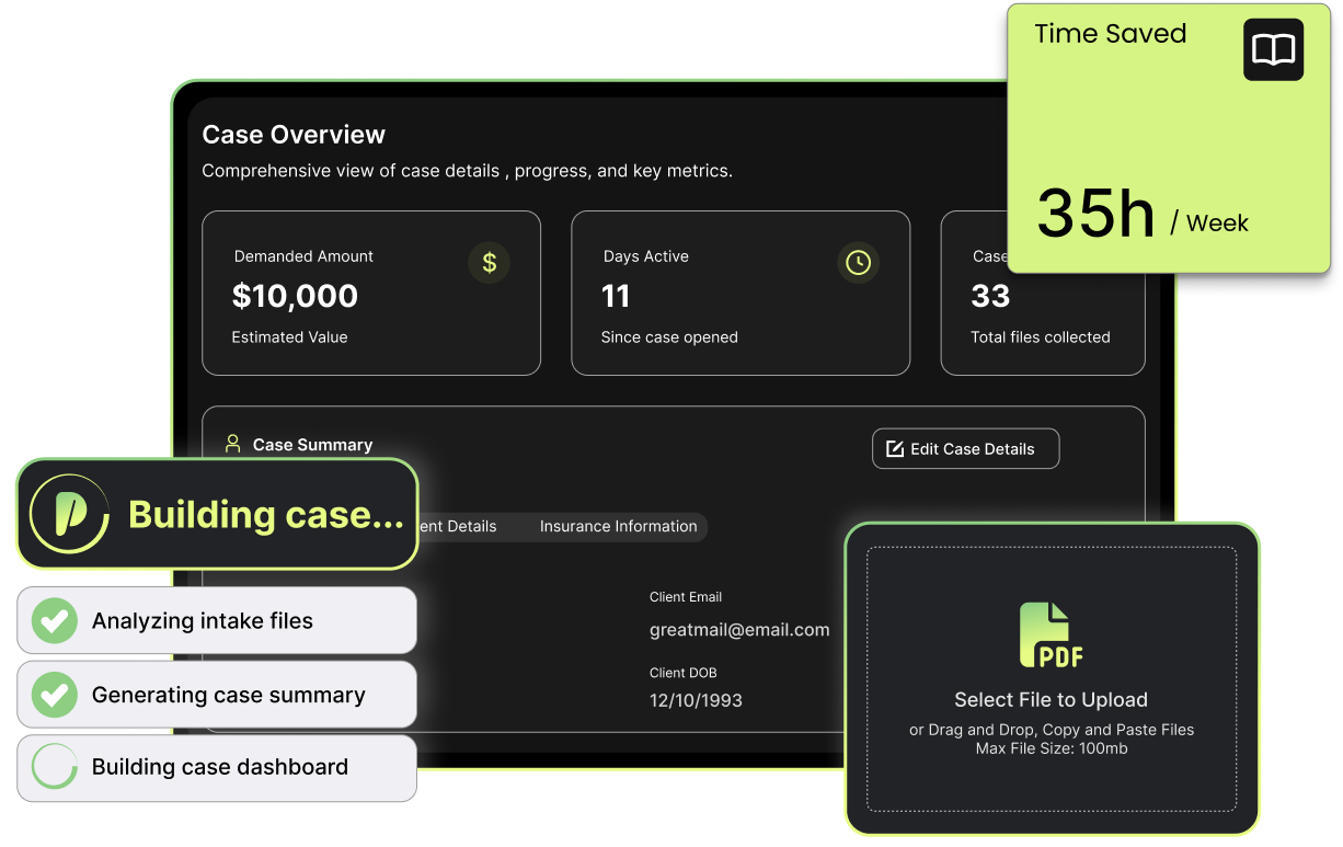 ProPlaintiff is purpose-built exclusively for personal injury cases, not adapted from generic legal software. It integrates seamlessly with our AI Paralegal (trained on 6.7 million case law files), enabling you to analyze documents, generate medical chronologies, and draft demand letters directly within each case file.