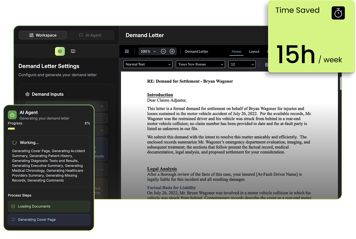 Build professional demand letters in minutes with AI precision. Cut your processing time in half of drafting demand letters.