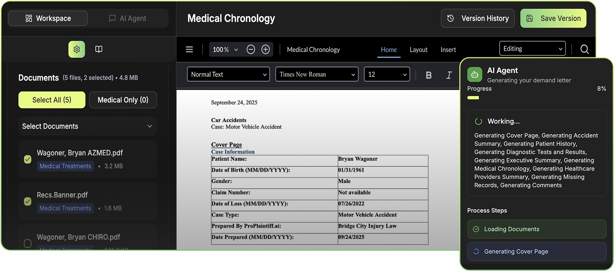 ProPlaintiff.ai’s Medical Chronology feature is specifically designed to address the unique challenges faced by personal injury professionals. Whether you're building demand letters, preparing for depositions, or evaluating a case for settlement, having a clear and organized timeline of medical events is crucial.