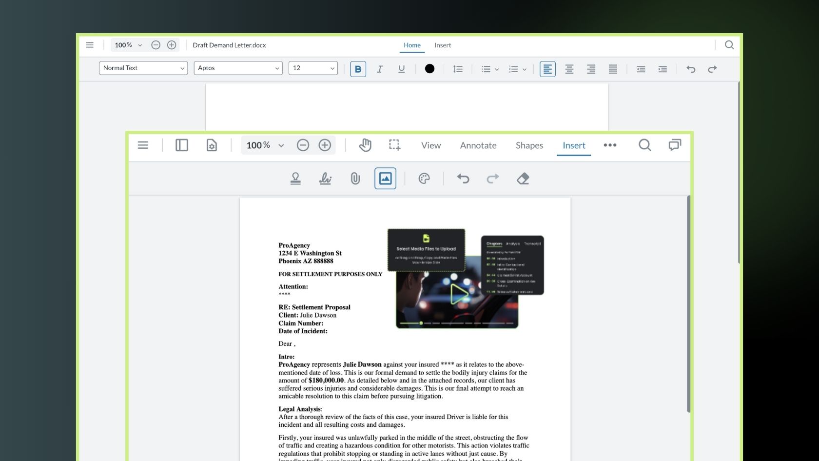 Work smarter with our side-by-side document review feature. Easily view all uploaded case documents next to your demand letter to ensure consistency, accuracy, and thorough due diligence.
